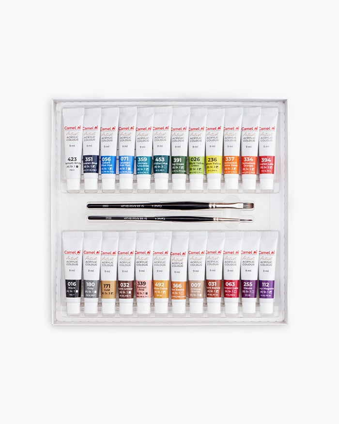 Assorted pack of 24 shades in 9 ml, 1 shade in 20 ml with Mediums and Brushes.